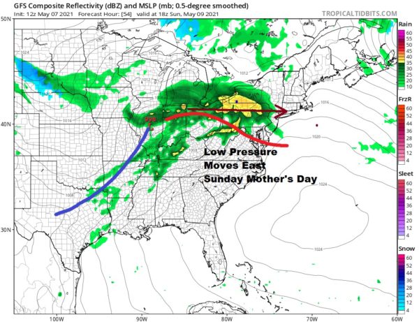 Saturday is a bit of a tough call with this upper trough overhead. We will certainly see lots of clouds and I will throw in the chance for scattered showers. Some folks will see rain, and some won’t. But it will be a cool day with the cloud cover so highs will just be in the upper 50s.