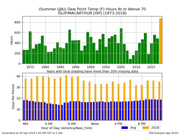 What an insanely humid summer it was for Long Island. When measured by the number of hours we spent this summer with dew points over 70, this summer as the highest since 1971! It was concentrated from late July through the month of August where we had to deal with this almost on a daily basis with only the occasional shot of brief relief.