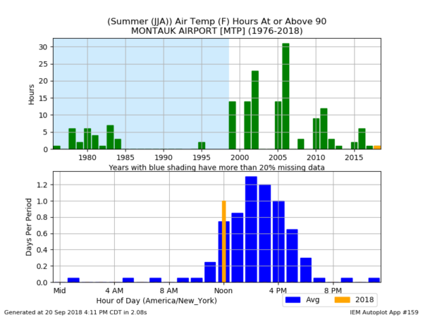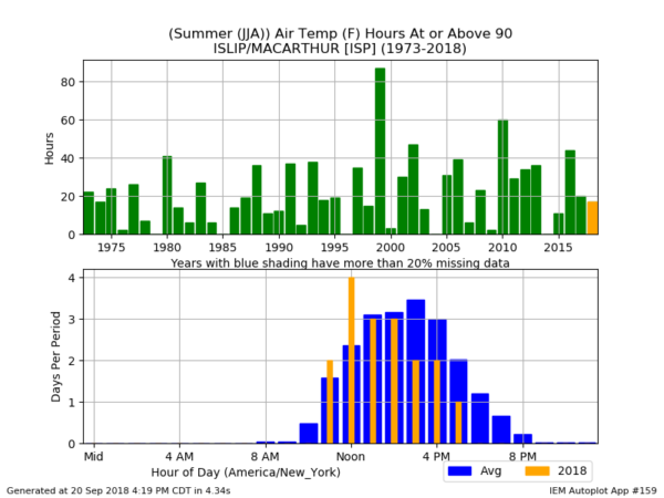 90 degree high temperature days weren’t too extraordinary though we did seen a higher than normal and later than normal stretch of 90 degree plus days over Eastern Long Island. In terms of the number of hours where temperatures were over 90 degrees Montauk saw a few but nothing like 2006 where the temperatures were over 90 for more than 30 hours over the summer season. Islip spent just under 20 individual hours where the thermometer stood over 90 degrees which looks like is close to the longer term average. It was the humidity that made things feel a lot worse.
