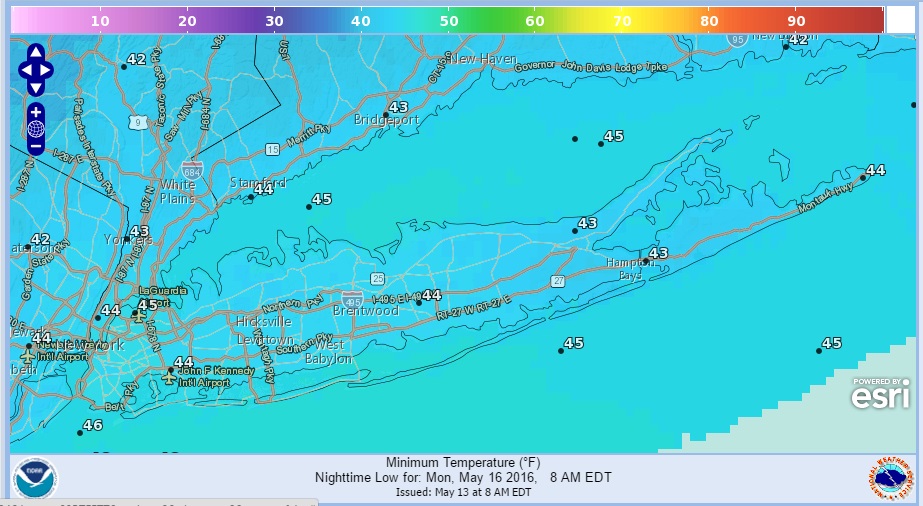 As for Monday night into Tuesday morning clouds may be the saving grace by then as the next weather system begins its approach from the southwest. So at least for now Long Islanders do not have a frost or freeze issue to worry about this weekend.