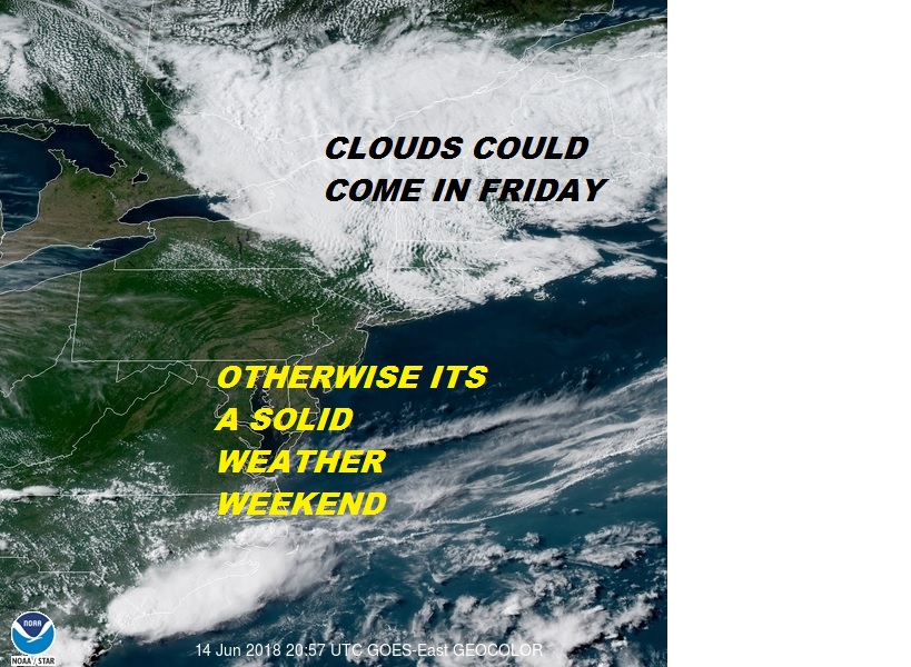 This was quite the day on Long Island. We had sunshine from start to finish and for the first time in over a week, the wind was not from off the ocean but from the northwest. That’s how all of Long Island gets warm and temperatures reached the low to mid 80s everywhere, even at the shore. The satellite loop shows clear skies overhead and we should be clear tonight but notice there are clouds to the north and northeast. This is due to strong Low Pressure sitting off the coast of Northeast Maine and that low is not moving very much. Those clouds could come in from the northeast on Friday which would make for a partly sunny cooler day with highs in the 70s. This is really the only issue going forward for the weekend. I don’t think it will be too problematic.
