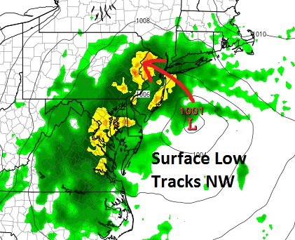 Here is the NAM Model forecast for Thursday morning 10am. The surface low is actually tracking northwestward from off the ocean which is rather unusual. It is rotating around the strong upper air storm in Eastern Virginia. This is the sort of thing that happens when tropical systems come up the east coast in the late summer and fall.