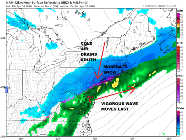 Think back to last Monday; this will be a repeat performance with snow developing during the early morning hours Saturday, probably around 4 or 5am and lasting until mid afternoon. The wave will be vigorous enough as it rides east northeast to the Virginia coast. From this point I’m favoring a colder solution here as cold air is ample and will drain quickly southward Saturday morning. The vigorous wave to the south will slide east northeast keeping us in cold air. Precipitation may start as some rain initially before changing quickly to snow Saturday morning.
