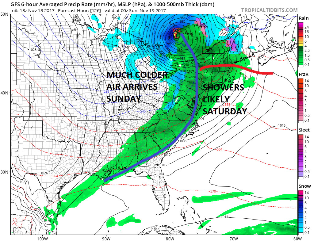 Saturday brings a good chance for showers as a cold front moves through with highs in the mid 50s. Behind it begins a shot of much colder air for Sunday and into Thanksgiving week. Sunday might be cold enough for a few passing rain or even some snow showers as an upper air disturbance moves through.
