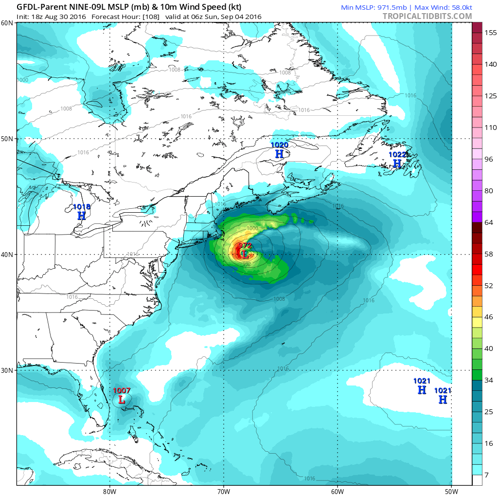 The map above is the GFDL model at 2am Monday when the system makes its closest pass to Long Island. Again this is only an issue regarding high surf and rip currents if this model is correct. There are still some variables to consider and we tackle that on our latest JOESTRADAMUS post.