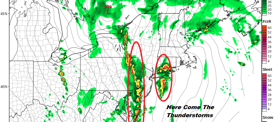 We are experiencing rough weather this evening as a cold front is moving through. Downpours and thunderstorms are impacting Long Island through the first part of tonight until the front passes. The marine layer usually weakens these storms however the storm to our northwest is strengthening and thunderstorms are drawing support from strong dynamics in the upper atmosphere. The satellite loop shows the thunderstorms like arms spiraling around the low center in Upstate Western NY. Look for some locally heavy rains with these storms and perhaps some gusty winds. They should stay just under the threshold of severe but the odd cell could fire up as the line goes by.