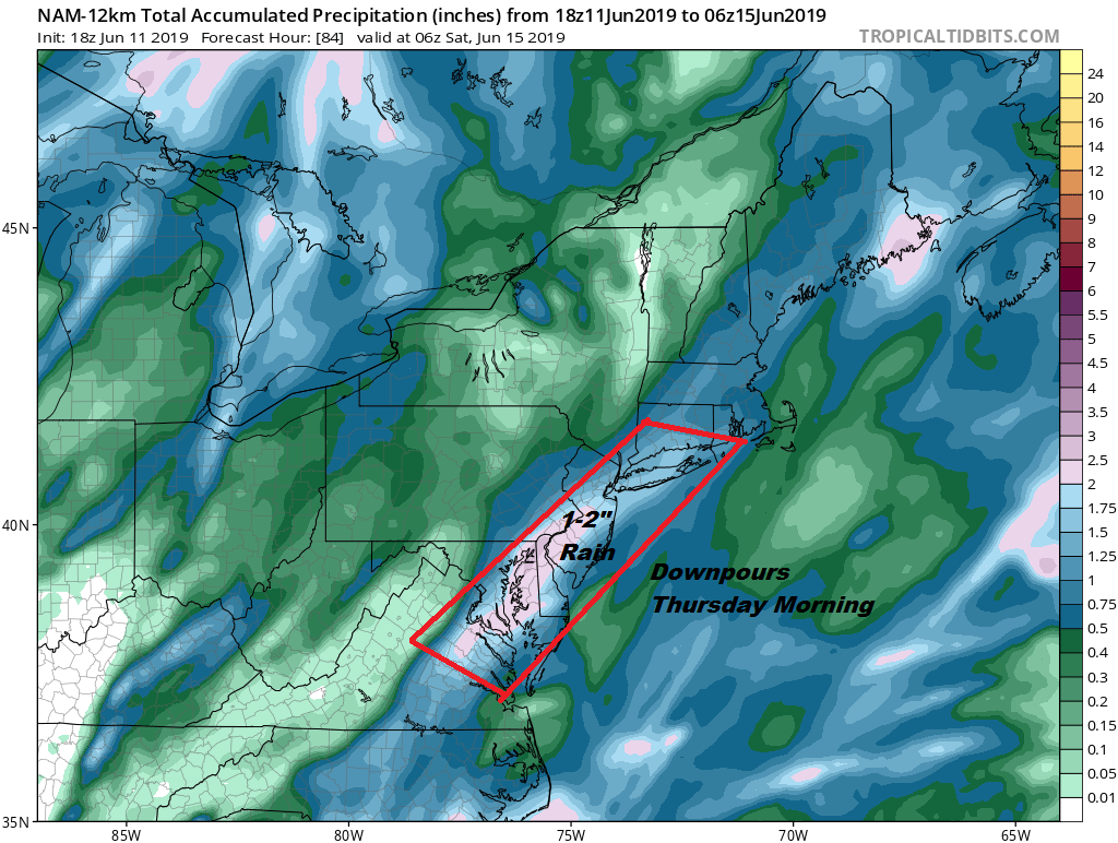 While the radar takes a break, we enjoy a nice day on Wednesday with sunshine most of the day. There will be an ocean wind and that will hold temperatures down a bit. Highs will be in the low to mid 70s except for 60s right along the shore. Other than some mid to late afternoon high clouds there are no issues. Tomorrow night will be mostly dry until the low starts to come up from the south. There will be a ball of downpours with this developing low. Winds will pick up from the east and southeast bringing in moisture. The dynamics here are actually robust so I think we will see rain with heavy downpours Friday morning between 5am and noon. Rainfall amounts of up to a couple of inches are possible until the low pulls away to the northeast.