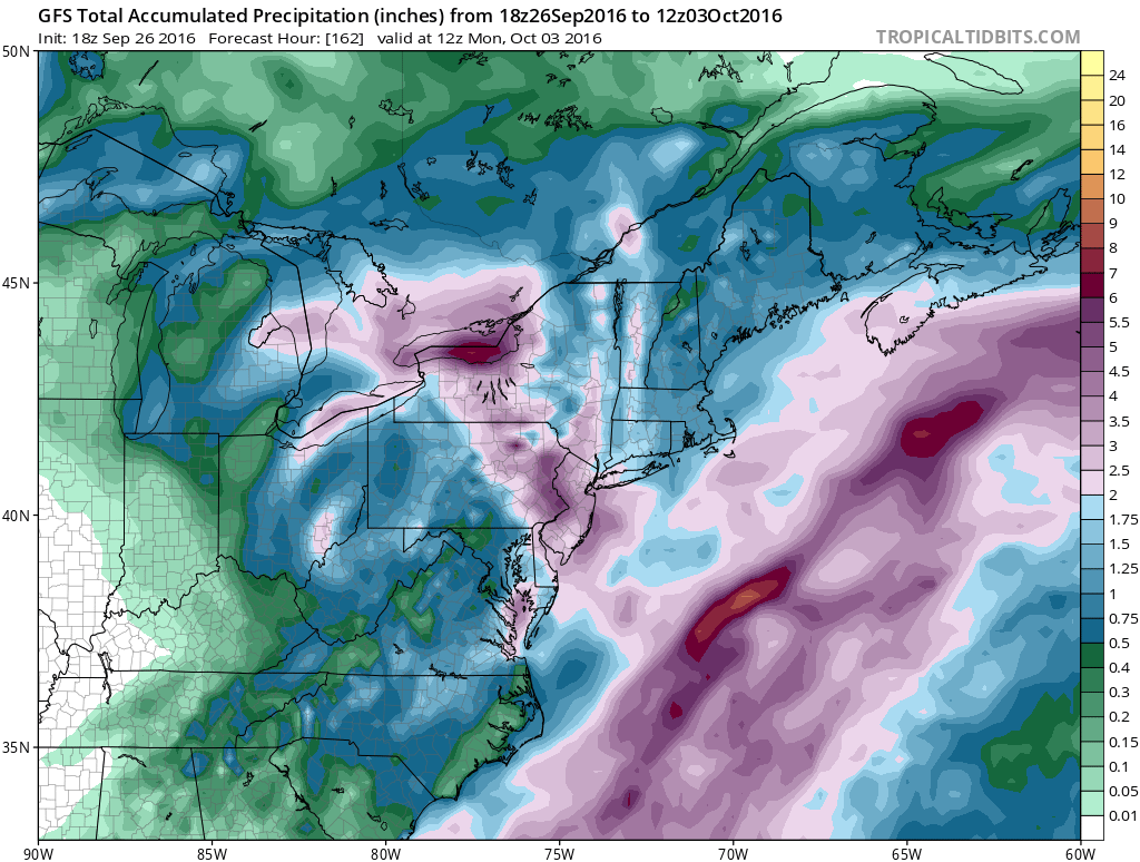 The latest GFS remains very bullish on total rainfall for the next 7 days showing 3 inch plus amounts in Nassau with a bit less in Suffolk but it will still be in the range of a couple of inches. Notice the 6 inch plus amounts just to the southwest. It won’t take much to shift it eastward. This is the first time in many months that we might see multiple days of rain over a 7 day period. This will not break the drought but if this pans out, it will go a long way to delivering some genuine drought relief.