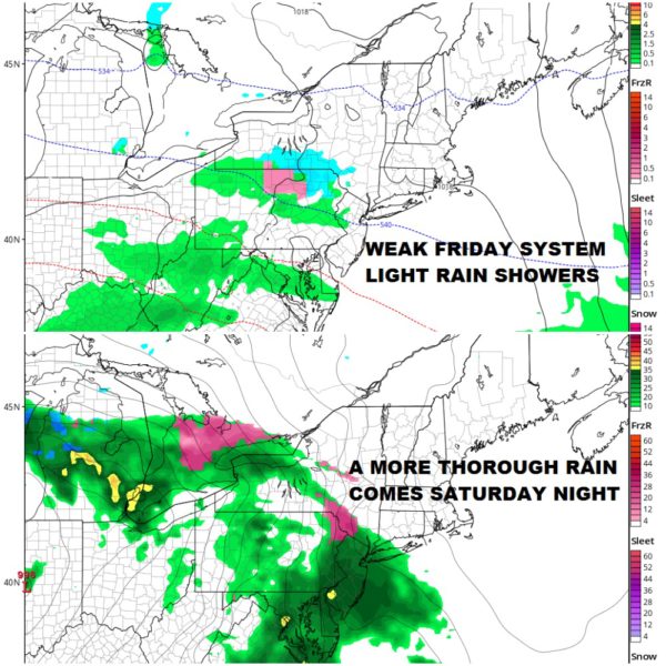 Friday will start off quiet but by the afternoon a weak clipper will bring a few rain showers to the area. In the higher elevations north and west of NYC they could come in the form of snow, with some very cold air aloft. A more soaking rain will come over the weekend. That storm system is just moving onshore along the California coast this morning, bringing some much needed rain to a state ravaged by wildfires. For us, that rain will arrive Saturday night, so any Saturday daytime plans will be okay. That rain will linger into Sunday morning and eventually taper, with drier conditions by the afternoon. Temperatures will briefly spike to around 60° during the afternoon before crashing back down early next week.