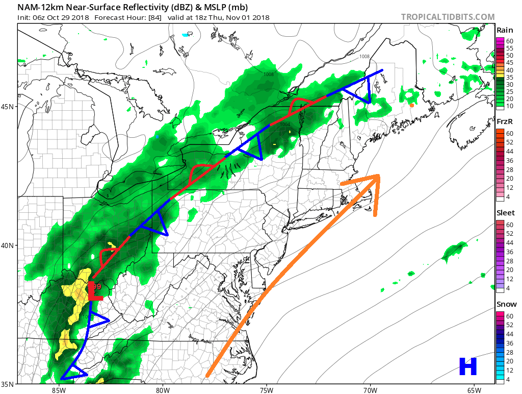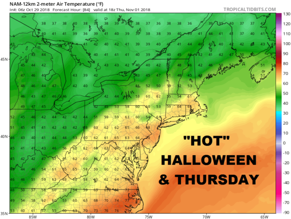 High pressure builds in overnight, which means clearing skies and a chilly Tuesday morning with lows around 40°. It also means plenty of sunshine on Tuesday and Wednesday as the high settles in to our south. At that time, a slow-moving front approaches from the west. The resulting southwesterly flow will mean Halloween highs reach into the 60s, with an outside shot at 70 on Thursday!