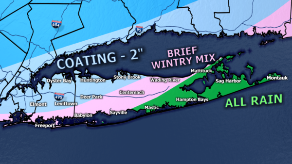 Precipitation will begin by mid afternoon, likely starting out frozen (snow/sleet/freezing rain) before eventually changing over to rain during the evening. The likeliest spots to see any slushy accumulations are Nassau and western Suffolk, where I am forecasting a coating to 2 inches. The rest of the island will either see a quick wintry mix at the onset, or nothing except rain. Regardless of what you get in your neighborhood, expect a very slow drive home tomorrow. Allow for extra time and take it slow.