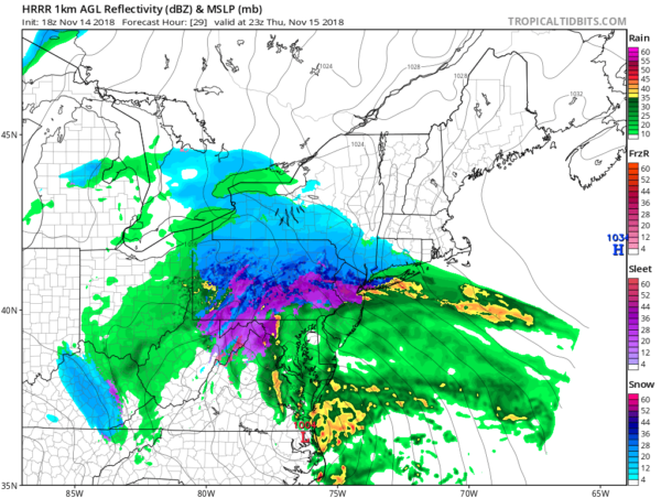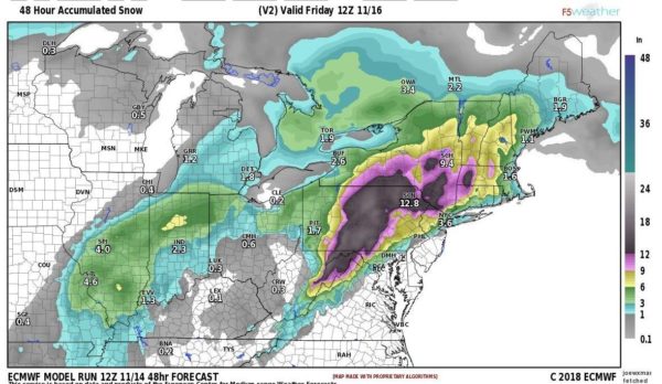 Areas well north and west of NYC could see higher numbers, as the changeover to rain will take place later on there. Some places may not see much of a changeover at all. Parts of northwestern New Jersey and the Hudson Valley may see numbers reach half a foot, especially those in the highest elevations. The models have been hinting at some surprisingly high totals across northern PA and into upstate NY – over a foot of snow! The best guess for this is a deepening upper level low creating heavy precipitation and a large column of frigid air cooling down to the surface. This would mean hours of heavy snow for these areas. It is certainly possible.