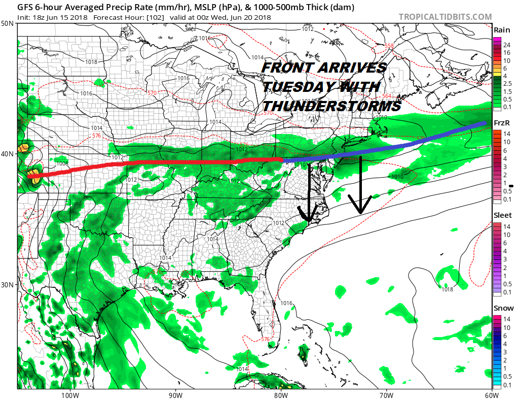 Widespread thunderstorms are possible at some point on Tuesday but that will depend on the timing of the front which we still haven’t quite worked out. Also the bigger question for later next week is whether the front keeps dropping south or stalls out and keeps the threat for showers in the forecast for Wednesday and beyond. We will work that out at some point in the next day or so.