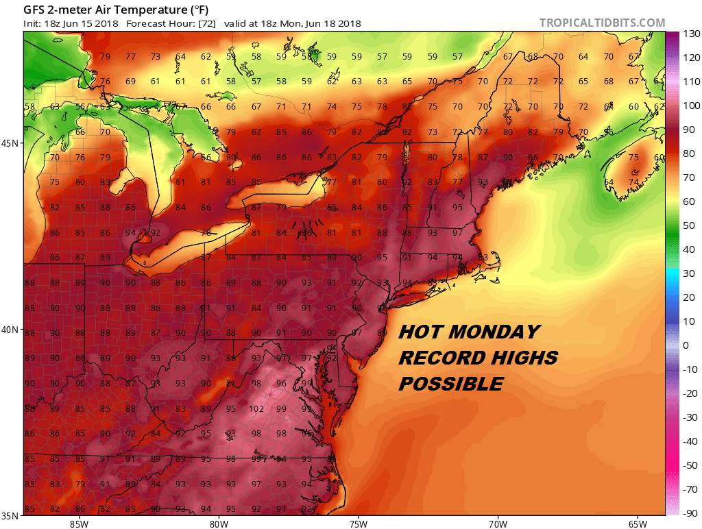 It is Monday that we are likely to see highs in the 90s in many locations including along the south shore. Also the humidity will be much higher so it will be uncomfortable. No showers or thunderstorms are forecast through the weekend but there is a chance that one or two scattered storms could pop up late in the afternoon or evening on Monday.