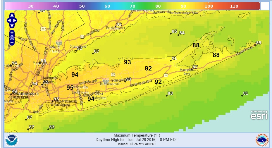 Now comes the payoff today for Long Island with sunshine and lower humidity. The heatwave issue for Long Island is difficult to measure. For much of Suffolk County and the south shore temperatures did not get above the middle 80s which means the heatwave ended there yesterday and starts fresh today. For Northern Nassau and Northwest Suffolk it is either day 5 or day 6 depending on where you are. Being an island with a dominant ocean wind makes long stretches of 90 difficult especially as you head east.