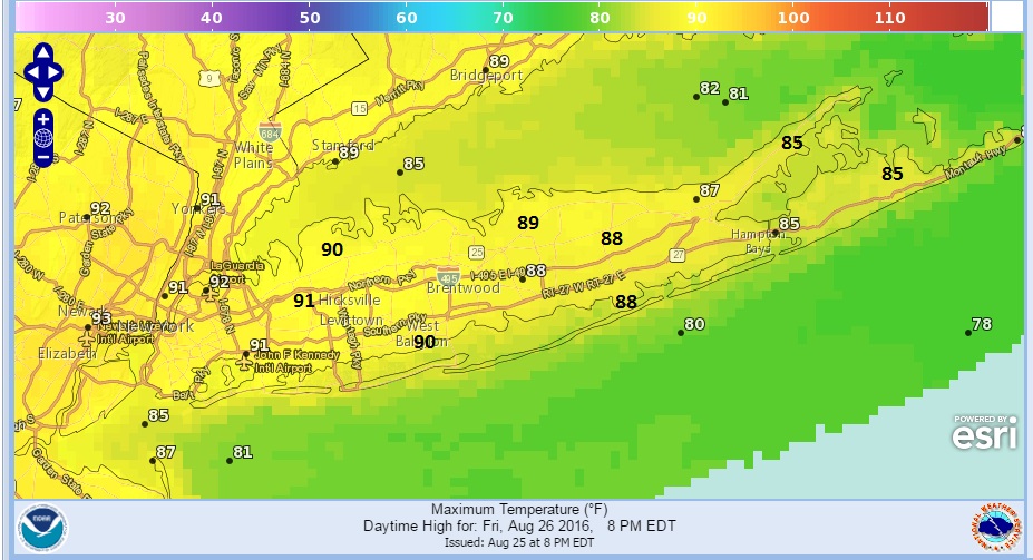 It is going to be a hot humid finish to the week with partly sunny skies on Friday. A weather front will be weakly moving through during the day with little impact other than clouds and maybe an isolated shower or thunderstorm. Regardless temperatures will reach the upper 80s to low 90s. Dew points will be in the lower 70s on average so it will feel like it’s in the mid to upper 90s. Great day for the beach if you took the day off.