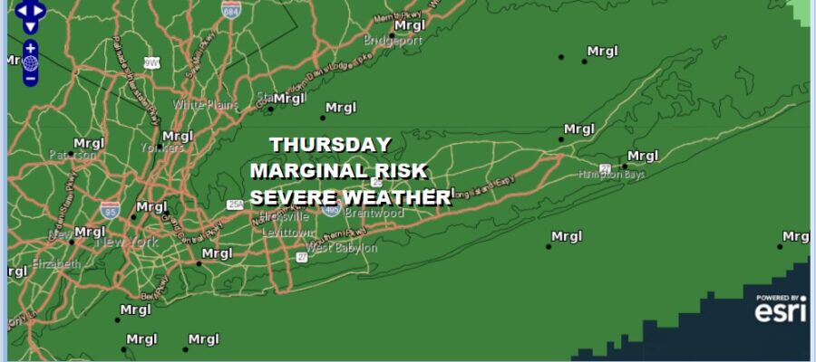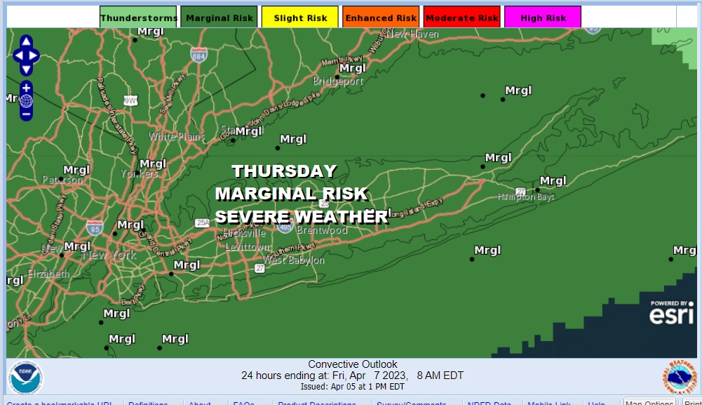 Moving in from the west Thursday will be a cold front. The dynamics Thursday are weaker than they were last Friday so we will see some showers when the front moves through late in the day and into Thursday evening. However temperatures will reach 80 or better to the west and south of Long Island so that allows for the possibility of some scattered thunderstorms in the mix. If there is enough heating and if the wind is more from the west than from the south, then there is a chance we could see some isolated severe thunderstorms. This is why the Storm Prediction Center has put Long Island at a marginal risk for severe weather.