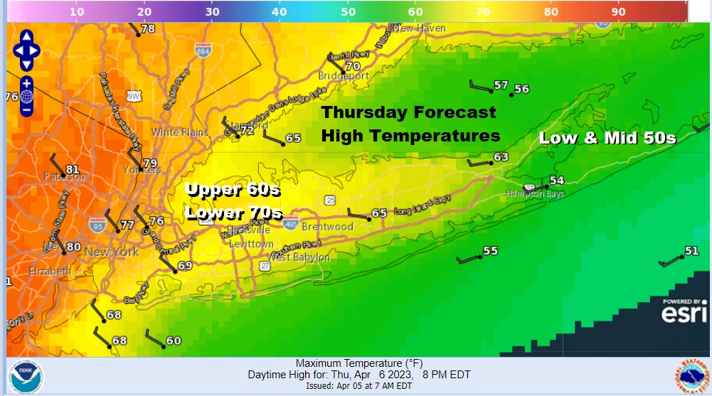 Once the front passes, it appears that we will have nice weather Friday right through Easter Sunday though it will be on the chilly side. Some sunshine is forecast each day with highs in the upper 50s to lower 60s Friday. Saturday highs will be in the lower 50s as the core of the chilly high builds in. Easter Sunday should be a nice day as highs will be in the 50s to around 60 degrees. Much of next week could actually be quite nice with no signs of another visit from the Curse of the Onshore flow and that could lead to a stretch of above normal temperatures for Long Island all next week.