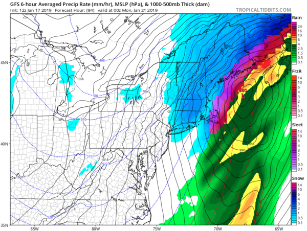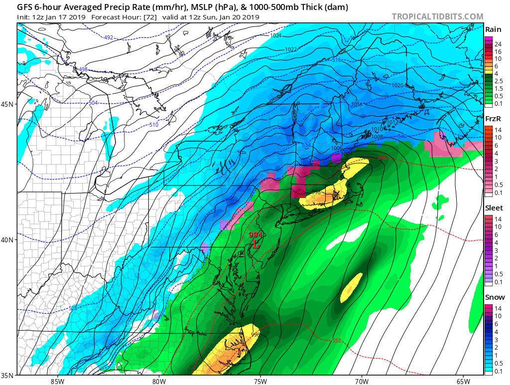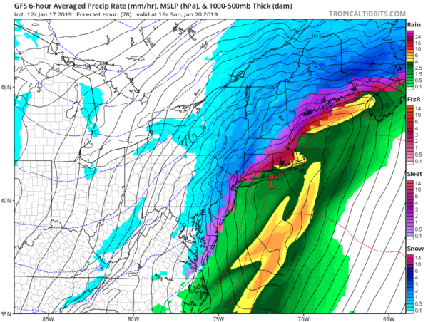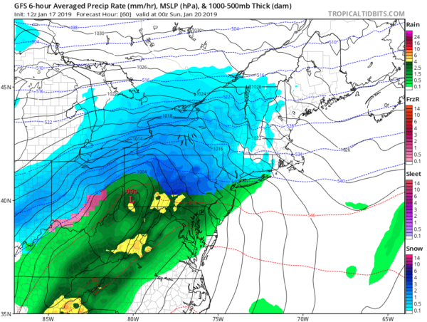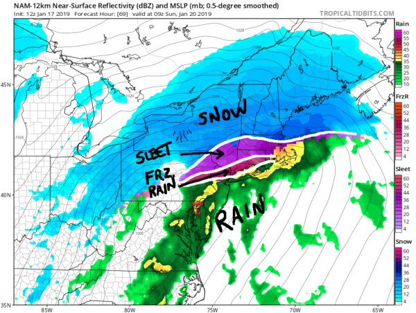 First, we will look at the GFS, which has remained very consistent over the last few days with a snow-to-rain-to-sleet-or-freezing-rain-back-to-snow solution over the course of this storm. Take a look: