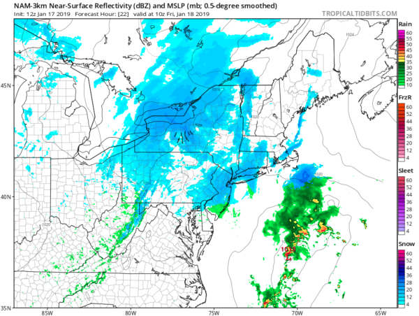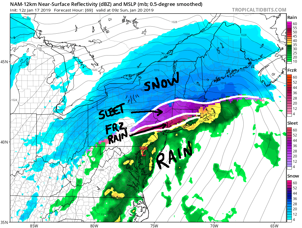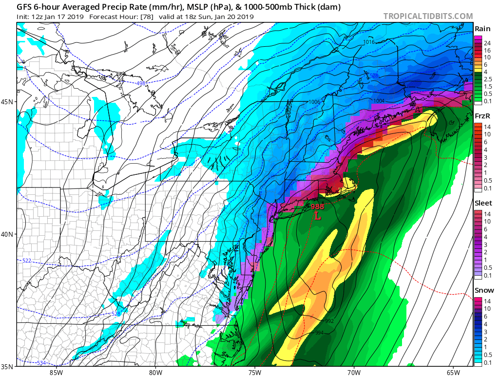 You can more clearly see the differentiation between the areas receiving rain/freezing rain/sleet/snow. As it stands now, Long Island would see snow mostly washed away by the rain, but there could be some dangerous icing conditions with freezing rain. Yes there is a very big difference between sleet and freezing rain. Sleet is a snowflake that melts and refreezes into a tiny ice pellet before it hits the surface. Freezing rain on the other hand is a melted snowflake (or simply a raindrop) that becomes super-cooled so much that it freezes on contact as soon as it hits the surface. While neither is optimal for any kind of travel, the latter can be downright catastrophic. This is why I am so concerned with things the way they look presently.