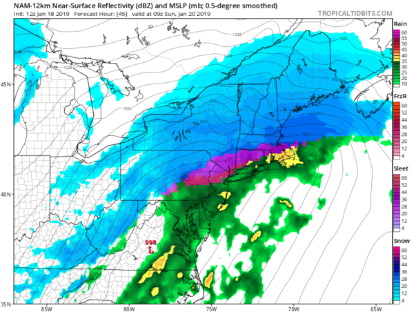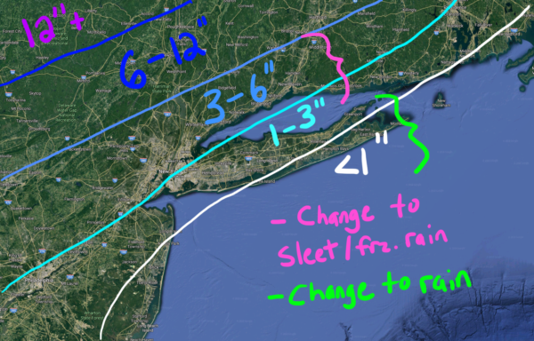 As we head into Saturday morning, rising temperatures will change this over to rain for most of the island. Winds will become gusty as well, perhaps leading to some minor coastal flooding. There are certain spots of the north shore that may take longer to change or go over to sleet or freezing rain for a while, prolonging accumulations and causing icy spots. This rain will be heavy (1-2″) and with such a juicy storm, some dynamic cooling is not out of the question, nor is some thundersnow! There have been some models that have trended warmer this afternoon, but I am sticking with my forecast for now.