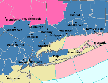 A weak system brought an inch or so of snow to Long Island last night into this morning. While skies have remained mostly cloudy, there have been some breaks of sun today, enough to melt most of what was on the ground. So we will be starting fresh come tomorrow night. Winter storm warnings have been issued for Nassau and western Suffolk, shown below in blue: