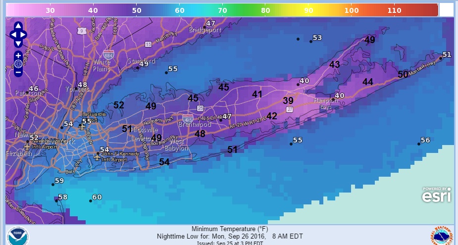 ‘After a spectacular early Autumn day with temperature in the 60s and plenty of sunshine, we are setting up or a very chilly night of clear skies and light winds. Most lows tonight will be in the 40s except for near or above 50 right at the shore. Some areas inland in the pine barrens will be in the upper 30s to lower 40s by daybreak.