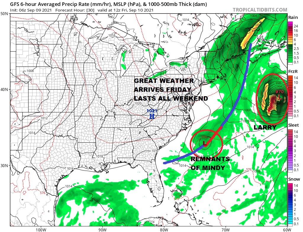 One of the very good things about this time of year is that we can get into long stretches of dry weather which quite frankly would be most welcomed considering how much rain we have seen lately. That is where we are beginning Friday and lasting through next Tuesday. This may actually be a good weekend for the Long Island beaches. Friday kicks it off with lots of sun but it will be cool with highs just into the lower 70s. Then we trend higher over the weekend. Sunshine Saturday will take highs to the mid to upper 70s. Sunday we will see sun and it will be a little more humid but not terrible. Highs will be in the upper 70s to lower 80s. Monday and Tuesday will be warm with highs into the 80s. No rain is forecast until maybe next Wednesday with the next cold front. If you are heading for the beaches Friday or Saturday there will be rough surf and rip currents leftover from Hurricane Larry.