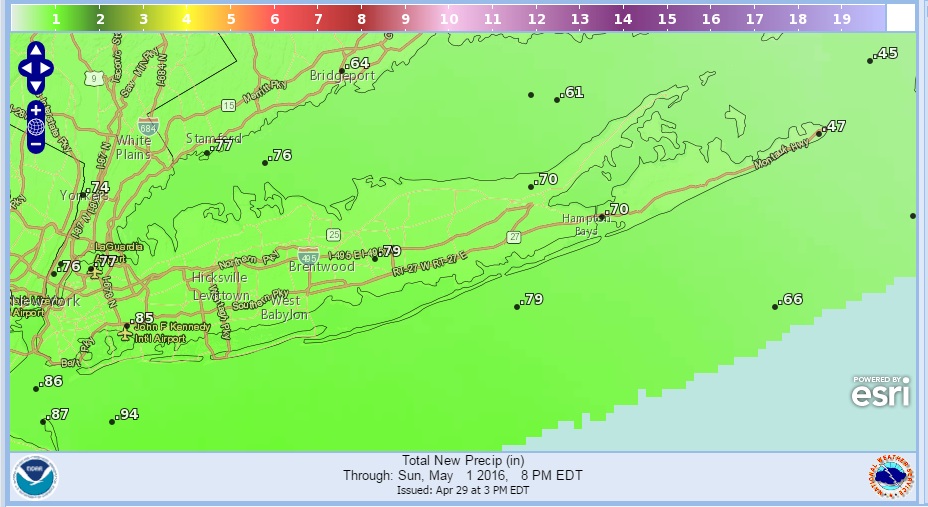 Rainfall forecast for Long Island Sunday looks like a solid three quarters of an inch for most places. This is consistent with the NAM model rainfall forecast below.