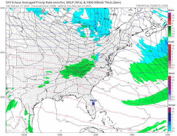 Thanks to the strong blocking signature in the Atlantic, weather systems are weak and getting suppressed to the south. You can see one such system passing well south late this week. There is another system behind this that stands a better chance of heading our way early next week (week of Jan 25th) and we will start taking a closer look at this in the coming days.