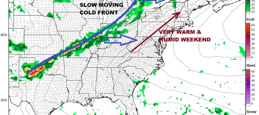 We are going to transition to a very warm and humid air mass for the weekend and early next week. In the transition Friday weak low pressure will spin out of that frontal boundary and meander northward Thursday night and Friday. This will bring some clouds on the scene for that time period. There might even be a few sprinkles or showers around later Thursday night into early Friday morning.