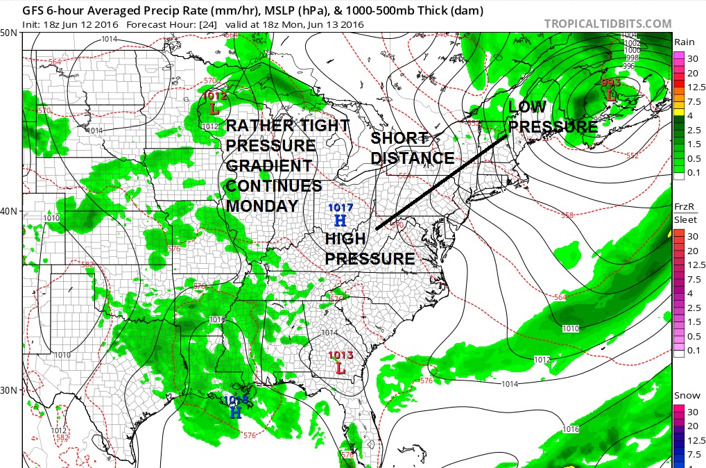 We have a tight pressure gradient across the northeast. Low pressure in Nova Scotia is strong. High pressure sits in Ohio. The difference in pressure between the 2 is large relative to the distance which is short. This creates a zone of strong gusty winds.