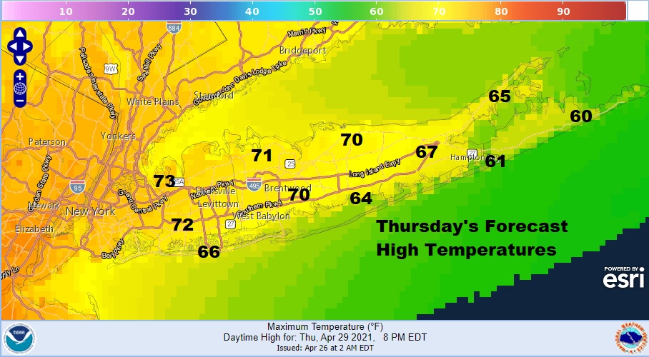 Long Island Heads for 80 Degrees Highs Wednesday Northern Nassau Northwest Suffolk