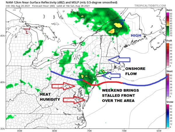Long Island is going to be south of the frontal boundary over the weekend which puts us in a weak onshore flow. At least that means that temperatures will probably not get much above 80 degrees both Saturday and Sunday. In fact the ocean wind will likely keep temperatures in the 70s all weekend long. The issue will be cloud cover and whether there might be some showers and downpours running around. I would describe both weekend days as cloudy to occasionally partly sunny with the risk for a downpour or a thunderstorm. Showers and thunderstorms will be more likely near the frontal zone which lies across Central New Jersey. Nonetheless the risk is there for some showers over the weekend but it should be emphasized that it doesn’t rain all the time and there will be long dry stretches in between any clusters of storms. We will be at the mercy of the radar over the weekend as to when anything happens and at what time so plan accordingly.
