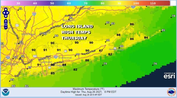 Here we are with another hot humid late August day on Long Island. It looks like another very good day for the beach or the pool. There isn’t much showing up on the satellite as far as clouds are concerned so we should see plenty of sunshine all day long. There is a small chance for a late day or evening pop up shower or thundertorm. I’m throwing it in the forecast just in case. Highs will reach the upper 80s to lower 90s with temps a little cooler at the shore.