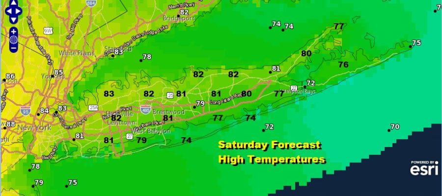 Saturday will be very warm and humid but the hot air will wait until Sunday to move in. Look for sunshine Saturday or at worst partly sunny. Highs will reach the low Northern Nassau and Northwest Suffolk County. Temperatures will be in the cooler 70s along the shore.