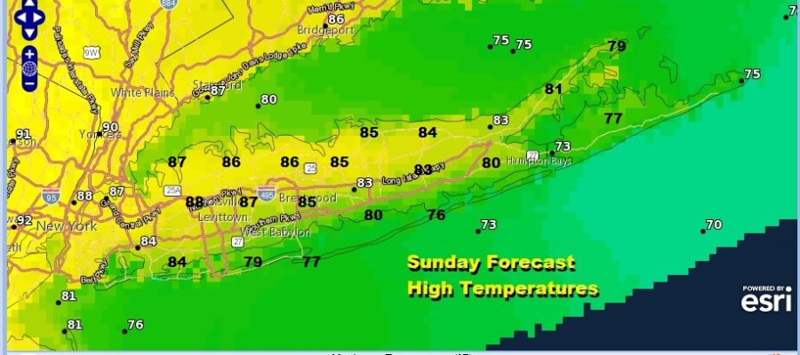 On to Monday where the southwest wind will have little impact in bringing cooler ocean air inland. We are at the time of year as water temperatures rise toward 70 degrees that the ocean has less and less of an impact except right at the beaches. Look for highs to reach at least the lower 90s inland and 70s to near 80 right along the shore. The East End should see their first long stretch of 80 degree plus highs especially away from the beaches.