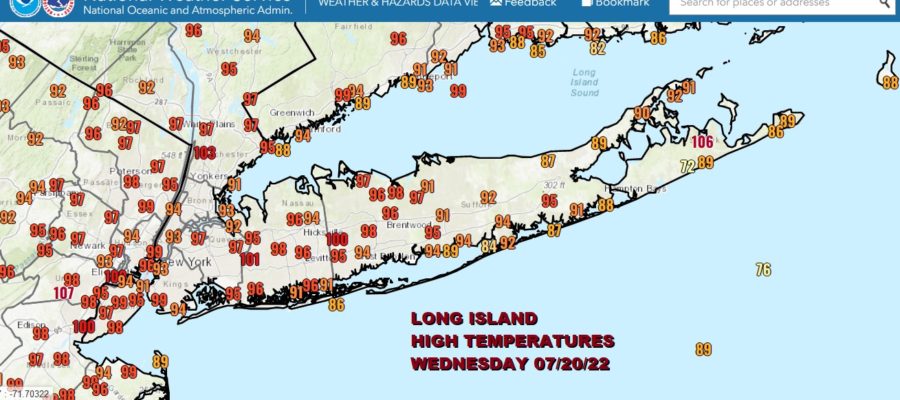 Tonight will be very warm and humid across Long Island with most lows in the low to mid 70s. Thursday the wind will be a little more to the southwest as we have a cold front approaching. While it will be very humid, the wind with a ocean component will probably knock the temperatures down a few degrees. Most highs will reach the lower 90s.