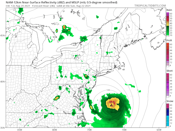 The first rains should arrive early Sunday morning. This is going to be relatively quickly lasting about 6 to 8 hours. Weather conditions are going to vary depending on landfall. The latest NAM model crosses Henri over the Twin Forks on a north northwest course around midday. The heaviest rain will be to the west of the track and the strongest winds to the east. Bear in mind that we are still seeing a wide spread in landfall possibilities as the National Hurricane Center cone of uncertainty indicates.