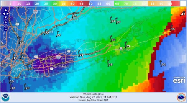 Once the center passes to the north the rains will move north with it so strong gusty winds will continue at least for awhile until the storm center moves far enough north. In terms of specifics as far as the winds are concerned here is the wind gust forecast for 11am Sunday including the wind barns which show direction