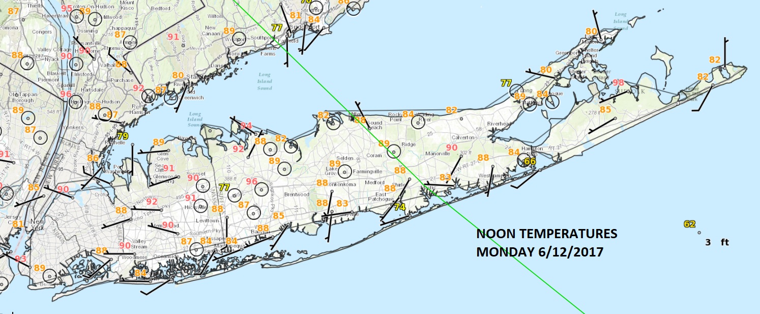 The Long Island heat is on today as temperatures everywhere except the immediate South Shore are in the upper 80s to a few lower 90s. Along the South Shore at the beaches it is in the pleasant 70s and that cooler air will work its way inland during the afternoon though it may take a little longer today than yesterday. We have deep blue skies and sunshine and the humidity is a little higher but it is still on the reasonable side.
