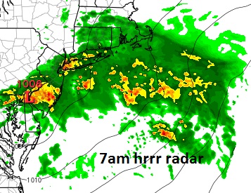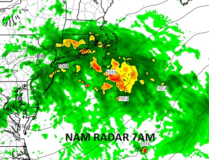 The blue area indicates 1 inch plus rains while the pink areas are 2 to 3 inches which is being indicated for Nassau County and Western Suffolk. The NAM model has less though it shows heavier rains to the north of Long Island and less in New Jersey! Now below are 2 simulated forecast radars. One is the HRRR model and the other the NAM model for 7am Tuesday.
