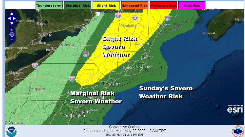 However we could see renegade thunderstorms form ahead of the cold front and as a result the Storm Prediction center has gone to a marginal risk for severe weather Sunday for the possibility of some isolated severe thunderstorms over Long Island and surrounding areas. The thunderstorms with the cold front will likely weaken when the front passes Sunday night. Monday brings some sunshine cooler and less humid weather with highs in the lower 70s. Tuesday we see sunshine and clouds with highs in the upper 60s. Long range the next chance for widespread shower and thunderstorm activity will be Friday but things are shaping up nice for the Memorial Day holiday weekend from this vantage point.