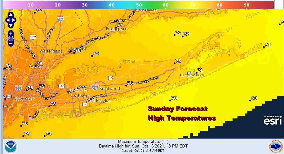 Long Island started off the weekend with some cool temperatures this morning as many areas in Suffolk County particularly in the pine barren areas bottomed in the 40s this morning. However the cool high from the north is now to the south of us today and that means a west wind and sunshine taking highs into the low and middle 70s. There are no weather issues today. The satellite shows very little as far as cloud cover is concerned and the radars are nice and quiet and will stay that way through Sunday evening.