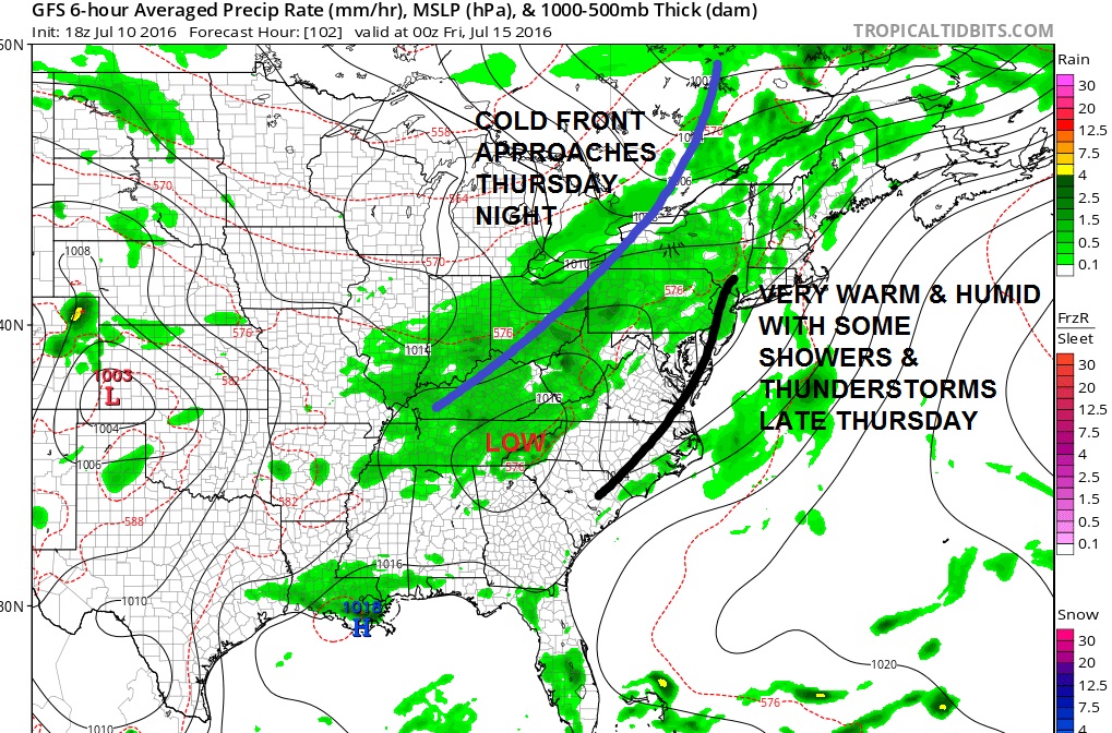 Thursday will be very warm with some sun and very humid with highs 85 to 90. There is a chance for thunderstorms in the evening as a cold front approaches. Other than this cold front there really isn’t much going on weatherwise this week.