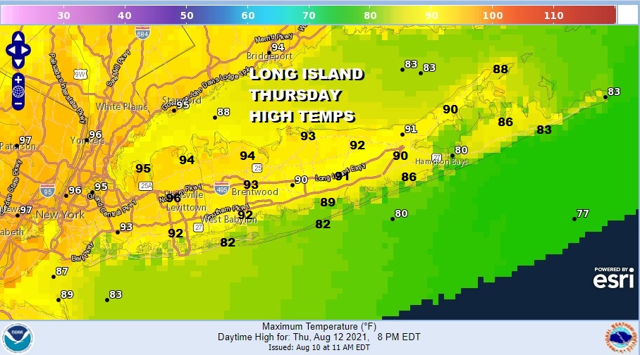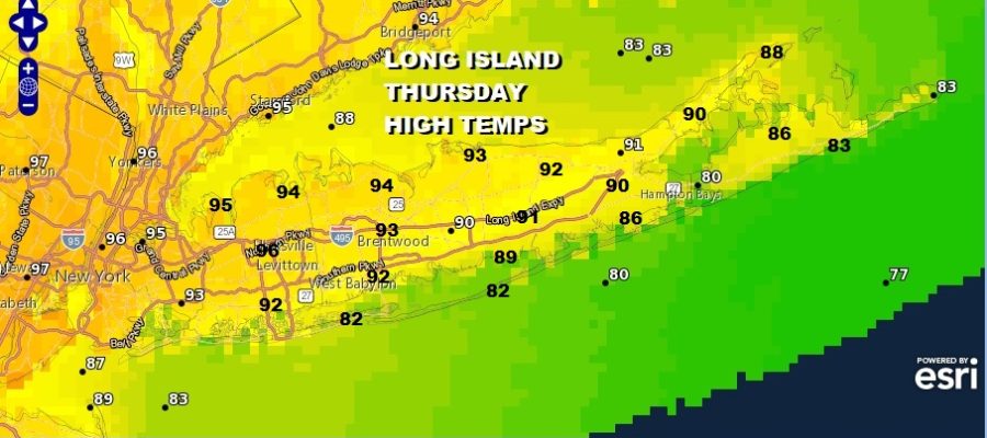 Thursday will probably wind up being the hottest day of the summer season for Long Island. Wind direction has kept Long Island away from temperatures much above 90 but we should see Thursday highs of 90 to 95 with cooler temperatures confined to the shore areas and also the East End but even here temperatures will be in the 80s. Severe weather risk appears Thursday to our west and we will include the chance for a late day shower or thunderstorm. Friday will be the last hot day of this stretch with highs in the upper 80s to lower 90s and the chance for late thunderstorms. There might be severe weather risk to deal with Friday however for now the best chances for severe weather will be to our west.