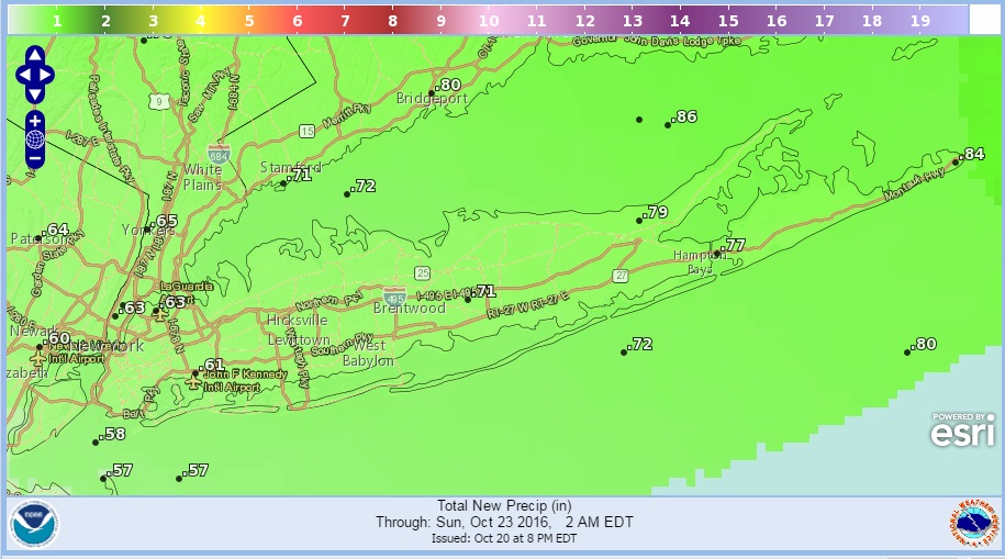 We are of course done with the record highs of yesterday and we saw the difference some clouds and an ocean wind can make as today’s temperatures stayed in the 60s to low 70s all day. Now we have some patchy drizzle that has moved in from off the ocean as a warm front comes up from the south. The rain to the west stays well to the west for the time being. Well to the south off the Florida coast is low pressure that is developing. That still has time to become a tropical or subtropical storm as it moves northward. While that system is no direct threat, it may play a role in slowing everything in the atmosphere down a bit. That opens the door to some rain here late Friday night and lasting into Saturday afternoon. Weather models today have been trending in this direction.