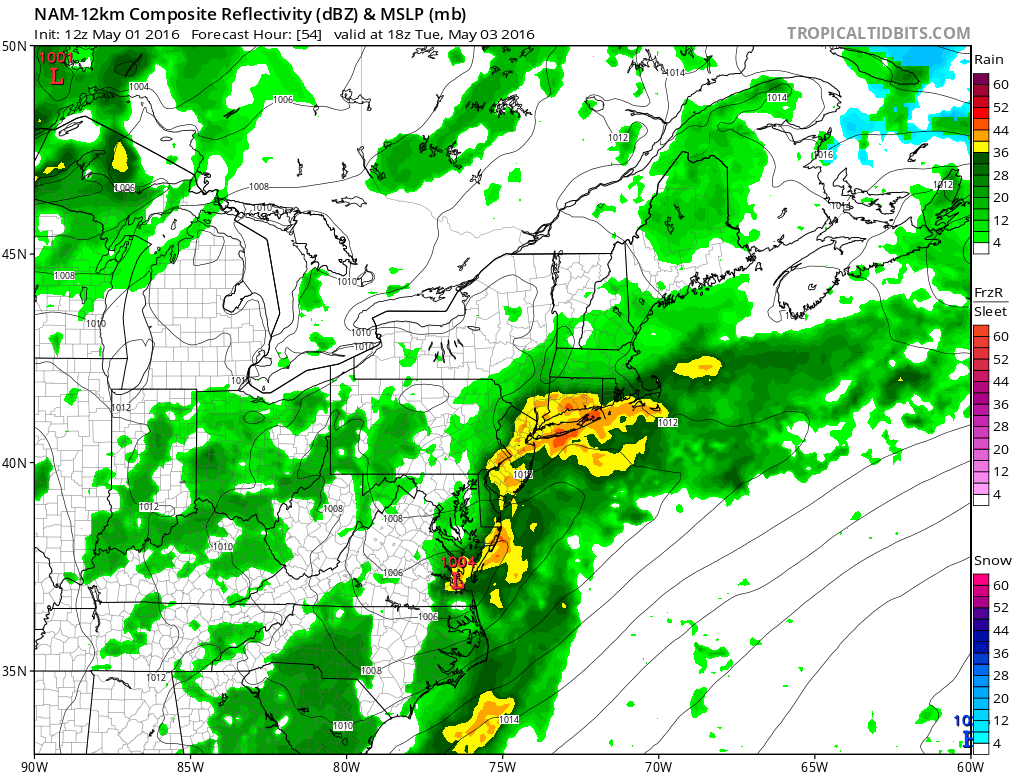 Most of the showers with the second part of this seem to track to the south across Central and Southern New Jersey on this model run. Temperatures Monday should reach the 60s as the onshore flow relaxes some.