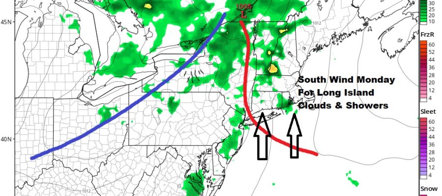 Tonight’s front stalls overhead and then becomes a warm front on Monday. Long Island will be on the east side of the warm front for much of the day. This likely means lots of clouds with a shower or thunderstorm possible until the warm front moves northward and then the cold front follows tomorrow evening with another shower or thunderstorm. Temperatures Monday will likely be in the 60s to near 70 all day. If the warm front manages to pass through and winds go southwest we could break above 70. The cold front follows with another shot for a shower or thunderstorm Monday evening into Monday night.