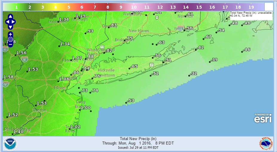 ...NASSAU COUNTY... MERRICK 1.72 1030 AM 7/29 BROADCAST MEDIA ...NEW YORK COUNTY... CENTRAL PARK 1.09 1220 PM 7/29 ASOS ...QUEENS COUNTY... NYC/LA GUARDIA 1.02 1235 PM 7/29 ASOS ...RICHMOND COUNTY... TODT HILL 1.29 1130 AM 7/29 COCORAHS ...SUFFOLK COUNTY... EAST MORICHES 2.08 100 PM 7/29 MESONET BROOKHAVEN 1.72 1220 PM 7/29 CO-OP OBSERVER WESTHAMPTON AIRPORT 1.29 1230 PM 7/29 ASOS MILLER PLACE 1.02 1120 AM 7/29 PUBLIC ISLIP AIRPORT 1.00 1230 PM 7/29 ASOS FARMINGDALE AIRPORT 0.99 1230 PM 7/29 ASOS UPTON 0.90 100 PM 7/29 NWS OFFICE HUNTINGTON 0.50 1230 PM 7/29 TRAINED SPOTTER